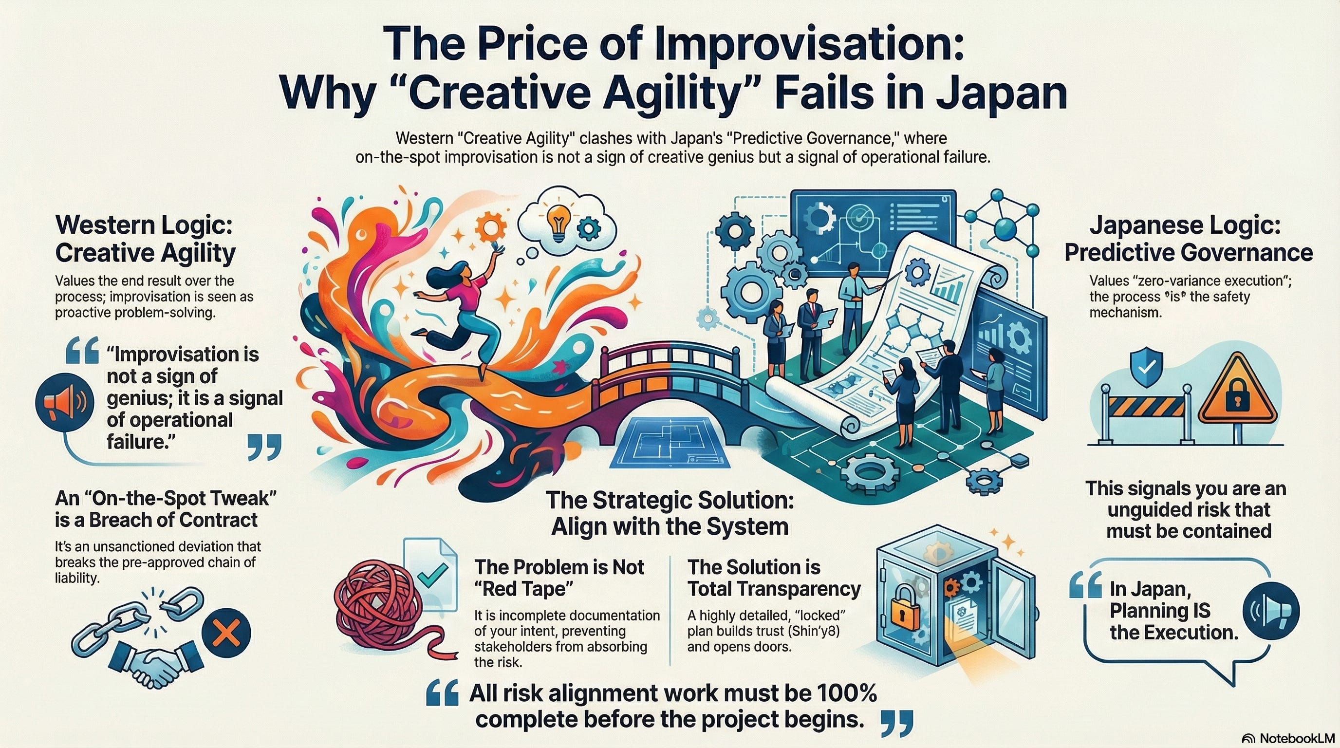 The production hasn’t stalled because of a language barrier. It has stalled because the global team is operating on a logic of “Creative Agility,” while the Japanese environment is built on a logic of “Predictive Governance.” In this market, when you deviate from the plan, you aren’t being “proactive”, you are signaling that you are an unguided risk that must be contained.