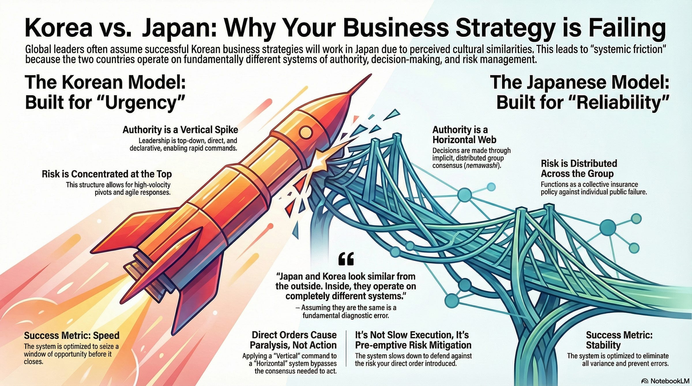 When a global lead demands “Korean speed” within a “Japanese reliability” architecture, the result is Systemic Friction. The Japanese organization instinctively slows down to verify the foundation the executive is trying to bypass. This creates a “Silent Failure”: momentum dies in the invisible layers of middle management because the “Direct Instruction” has bypassed the necessary internal consensus-building (nemawashi) required for a Japanese team to feel safe moving forward.