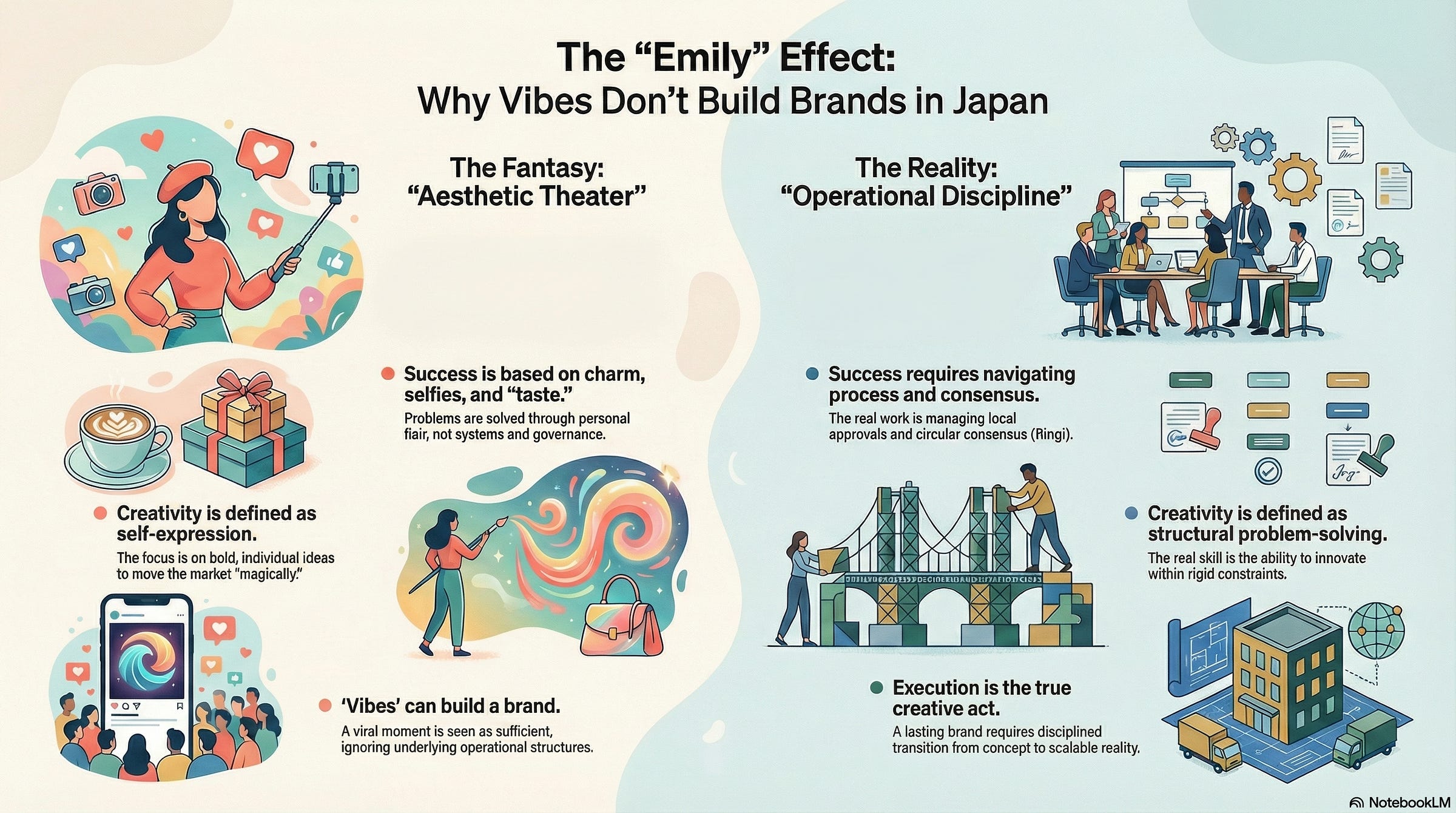 At Inside Brand Japan, we see this friction firsthand. Each year, a fresh cohort of interns and young employees arrives in Tokyo with a vision of brand-building shaped by the “Emily” archetype: a world where problems are solved through charm, selfies, and “taste” rather than systems and governance.