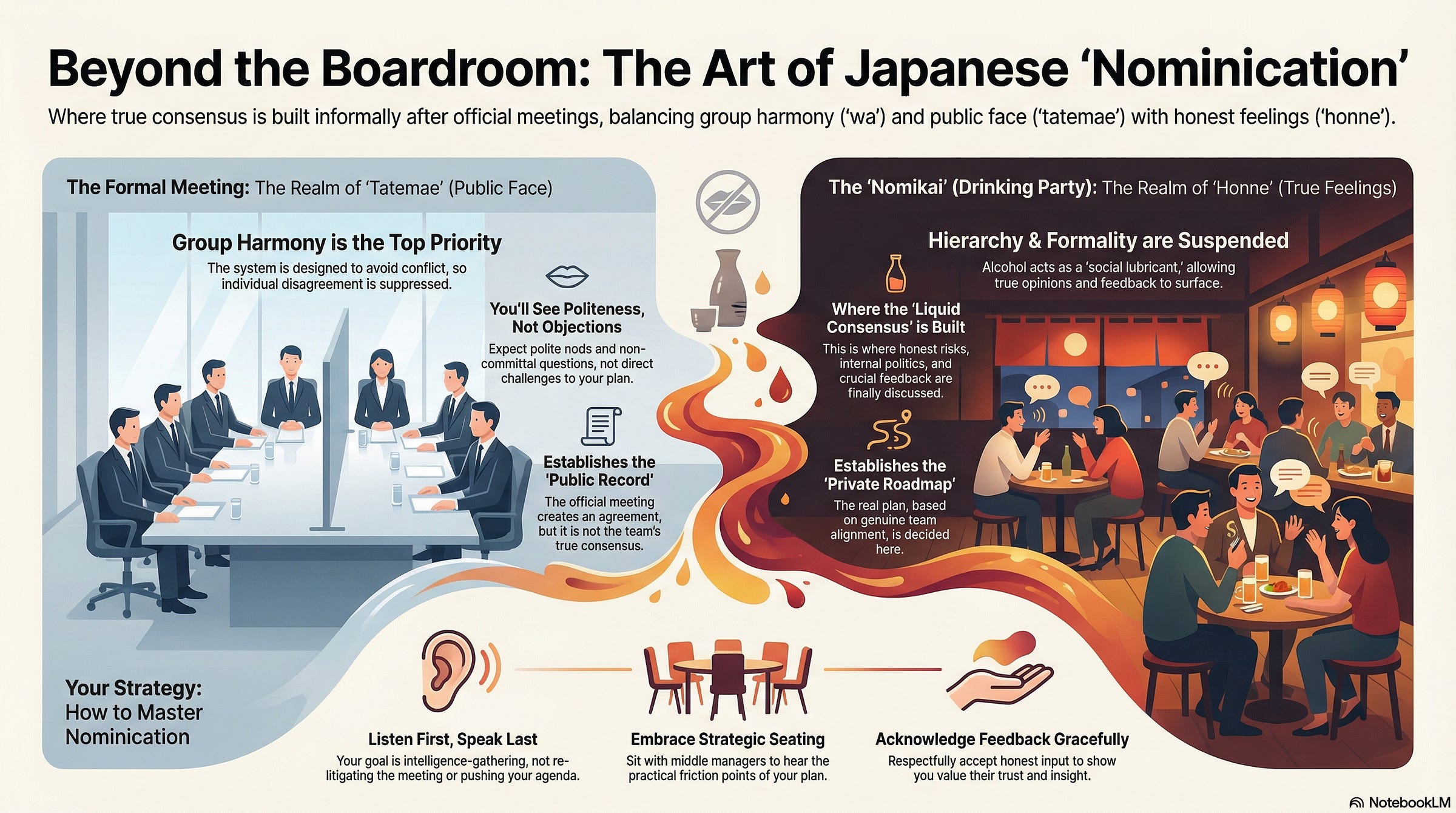 The foreign executive, still buzzing from the official, productive meeting, sat back in his chair at the izakaya. He had just presented his quarter-end strategy—a bold shift requiring internal restructuring—and the Japanese team, led by Buchō Sato, had listened, nodded, and offered only a few polite, non-committal questions about timelines. “Excellent,” the executive thought, “we have alignment.” Then the real evening began. The team shuffled into a different, slightly smoky venue. The ties loosened. The first few rounds were pure social lubricant—jokes about golf, toasts to family. But somewhere around the third beer, Buchō Sato leaned in, his voice low, his formal posture entirely gone. “Your strategy,” he murmured, “is brilliant for the long term, but the timing will destroy our Q1 morale. We must delay the announcement until after Golden Week.” All the data, all the polite nodding, was instantly vaporized. The true, unvarnished feedback—the necessary caveat that saves the entire rollout—had just been delivered in a whisper, not a whiteboard. This is the sacred, unwritten rule of Nominication.