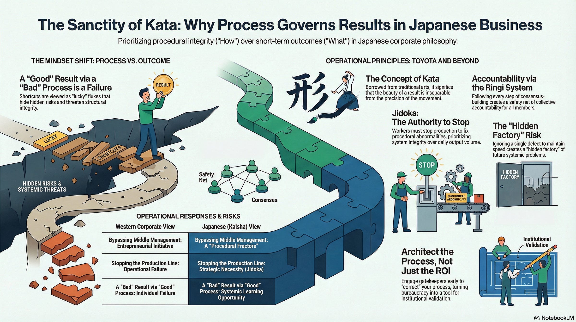 In a traditional kaisha (corporation), the process is the guardrail against chaos. When a manager follows every step of the ringi (consensus-building) process, they are weaving a safety net of collective accountability. When someone cuts a corner to achieve a faster result, they tear that net. If the project eventually fails, the person who followed the process is protected by the system; the person who bypassed it, even if they initially succeeded, is left exposed. To the Japanese establishment, a “bad” result following a “good” process is a learning opportunity. A “good” result following a “bad” process is a systemic threat.