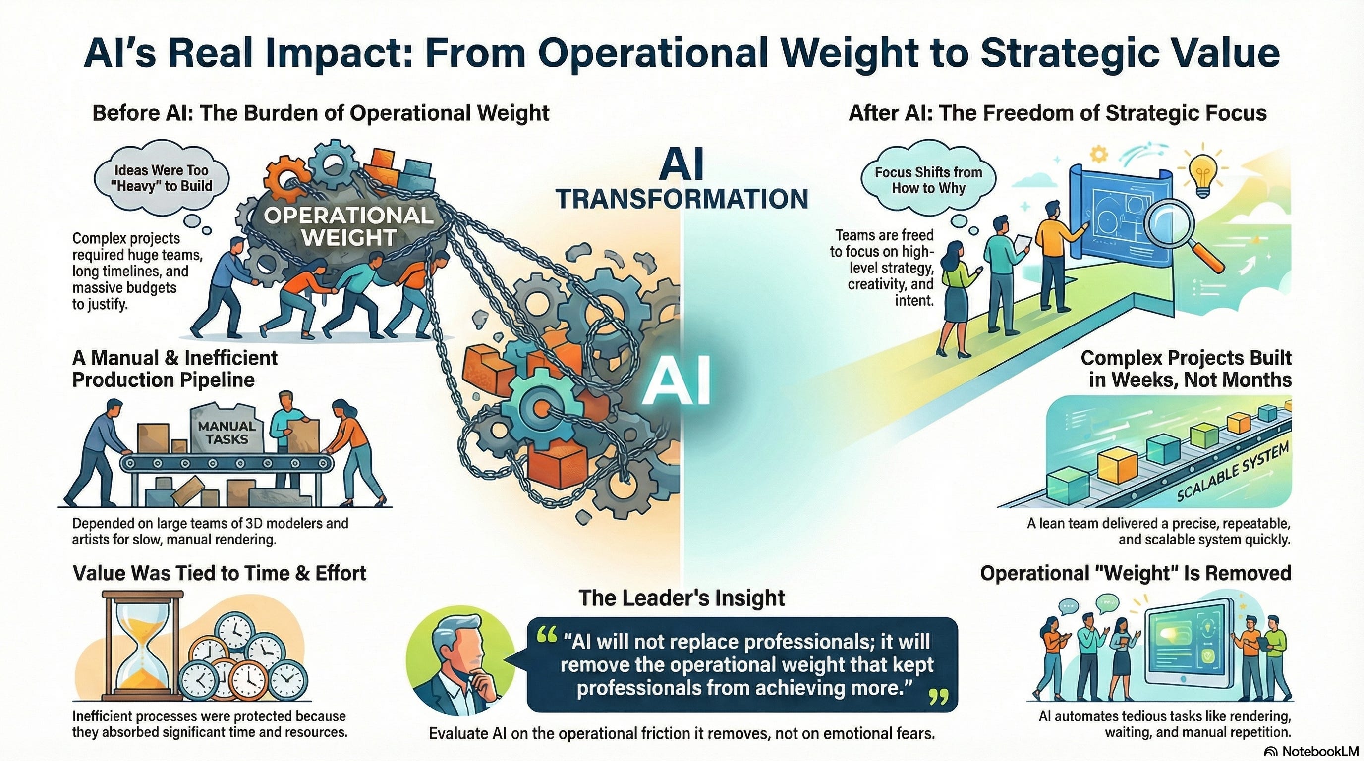 In short, AI doesn’t threaten the professional—the strategic mind or the creative eye. It threatens the parts of the professional’s job that were never truly value-generating to begin with: the waiting, the rendering, the tedious manual repetition. It is the removal of this weight that triggers resistance, because executives and teams are forced to confront the previously hidden cost of their operating inefficiencies.
