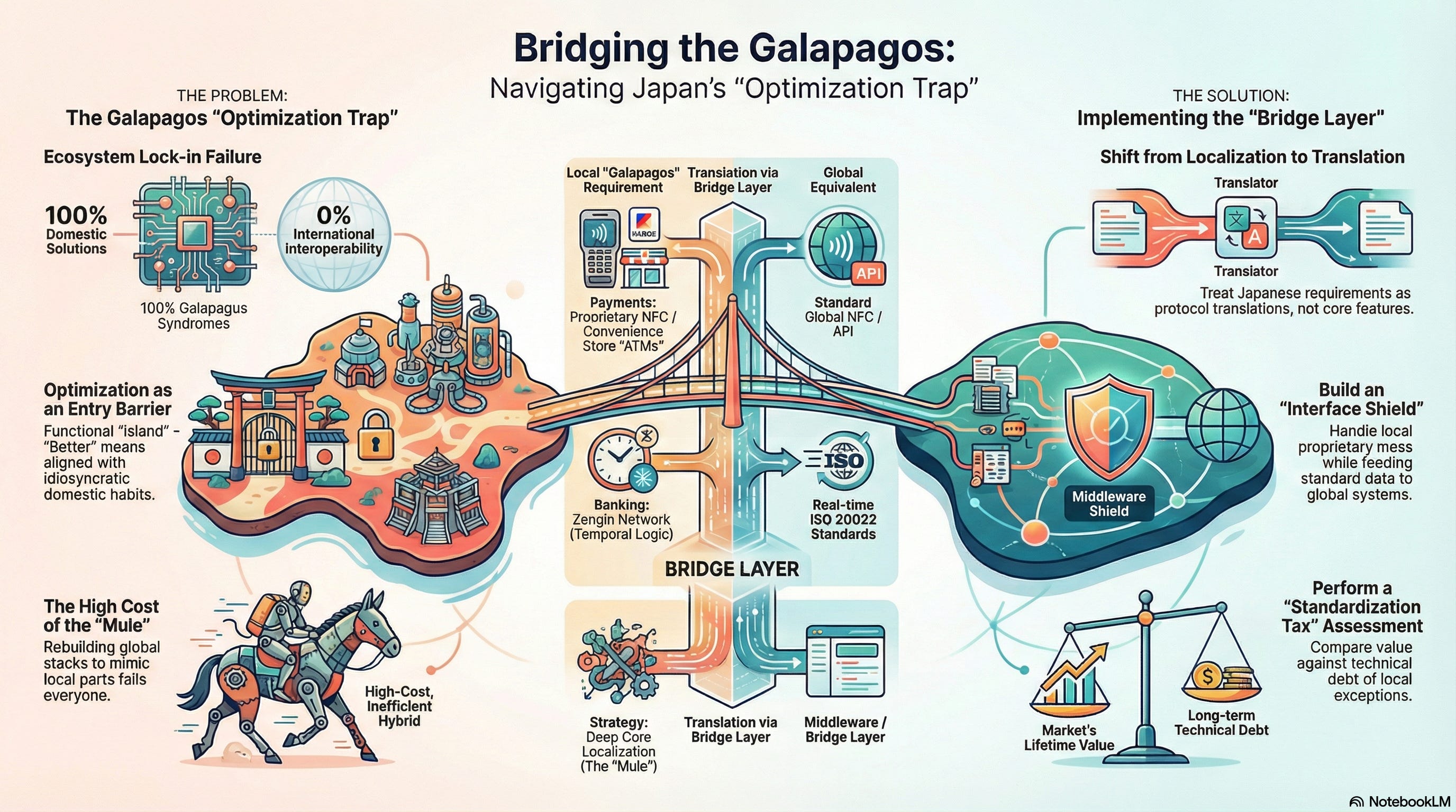 Japan’s most successful systems from mobile web protocols to modern payment gateways were designed to solve 100% of a local problem while assuming 0% international interoperability. Because these systems reached critical mass within the domestic market decades ago, the cost for a Japanese corporation to switch to a global standard is higher than the cost of maintaining a redundant, isolated legacy system.