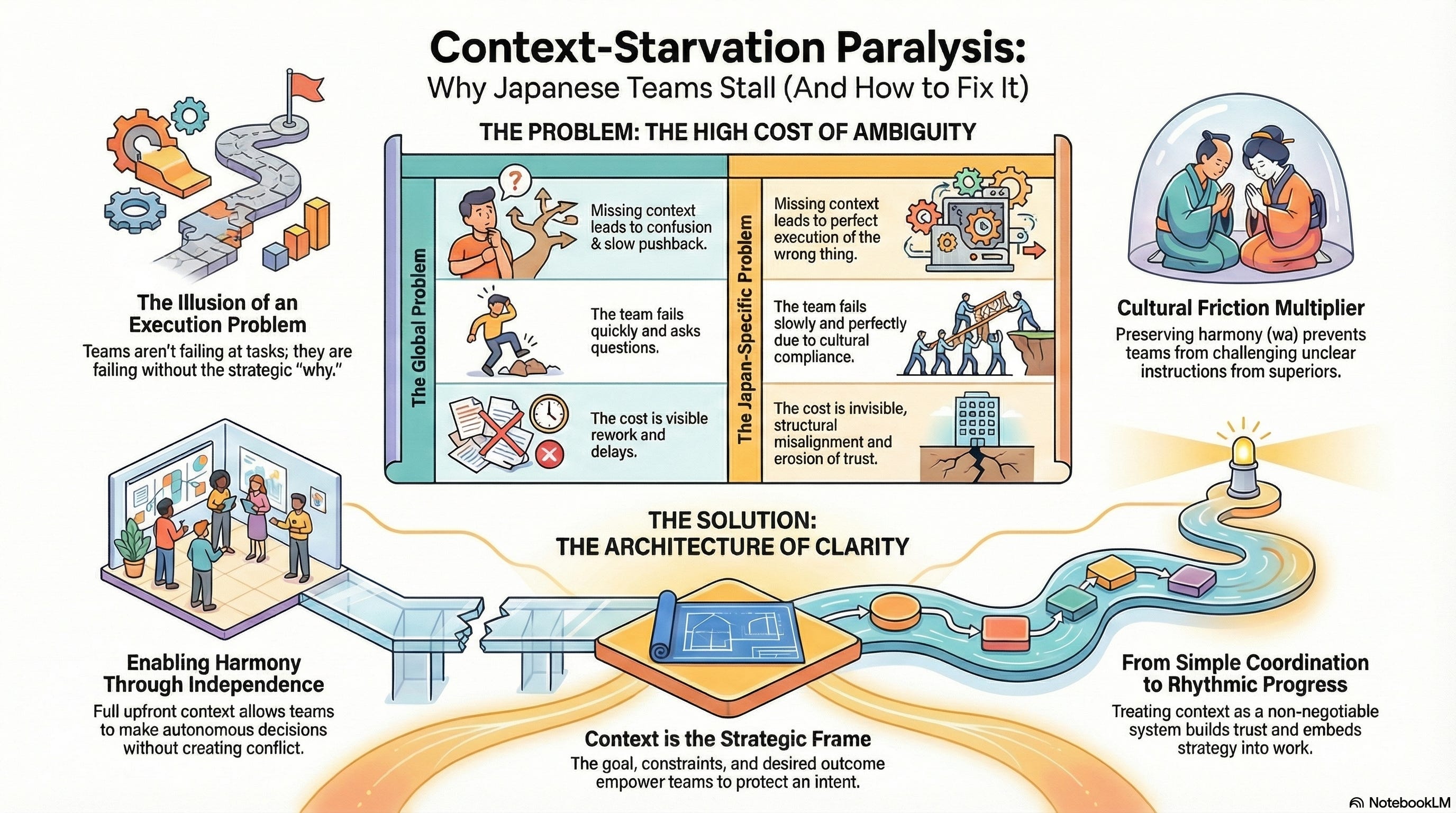 This liberation is essential in Japan because it acts as a cultural workaround. If a Japanese team is given full context upfront, they do not need to challenge the instruction later. They can proactively engineer the deliverable to fit the desired outcome, preempting the conflict that would otherwise arise from misalignment. Context, therefore, acts as an enabler of harmony and independence simultaneously.