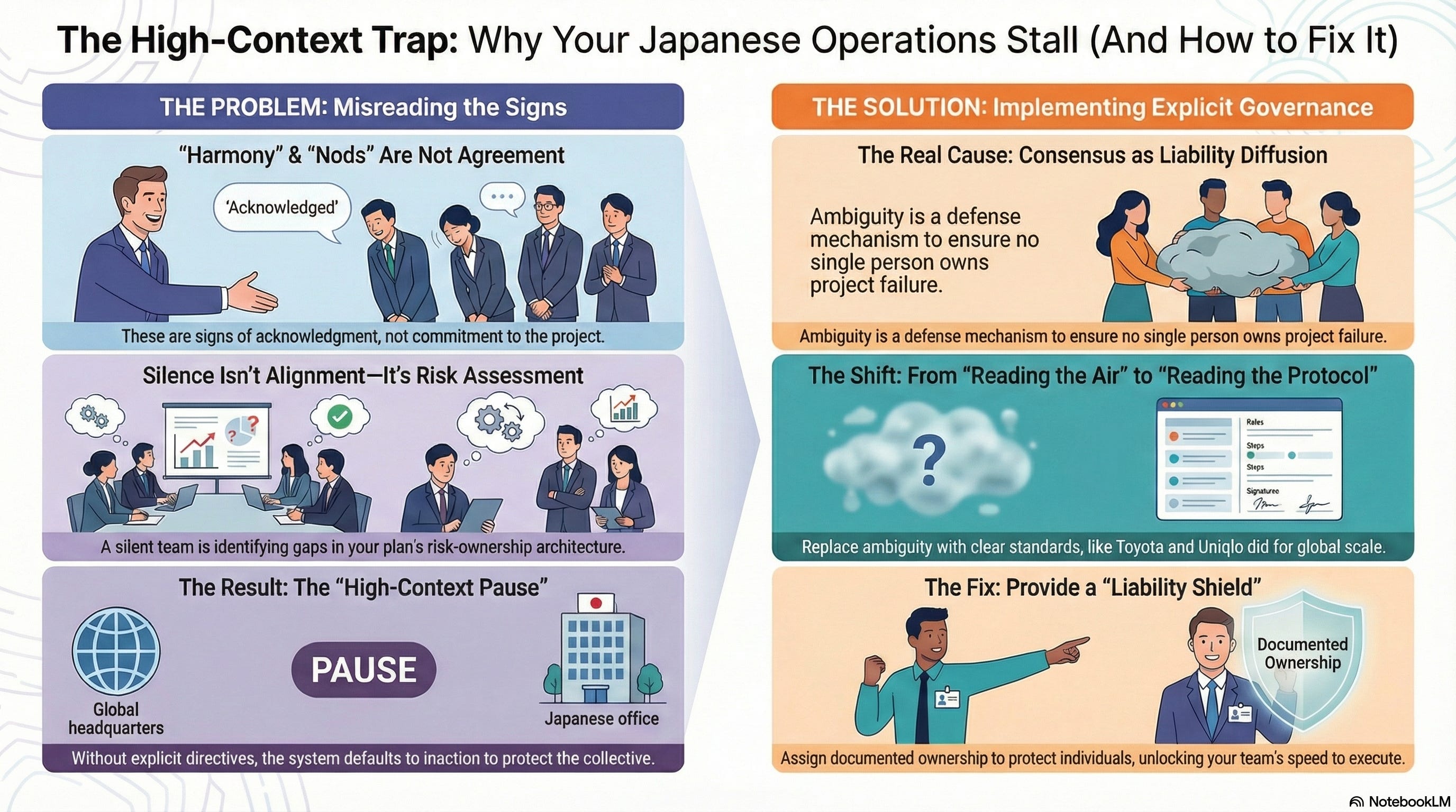 In reality, the project stalled the moment the meeting ended. The “nods” were not markers of agreement; they were markers of acknowledgment that the VP was speaking. The “harmony” was not alignment; it was the absence of public conflict. Because the VP failed to secure explicit, documented ownership for each milestone, the Japanese system reverted to its default state: The High-Context Pause. In a Japanese organization, if a directive is not explicit, it does not exist. What the global office calls “reading the air,” the local team uses as a filter to see who is actually willing to sign off on the liability. Without a name attached to a risk, the system structurally prevents progress to protect the collective.