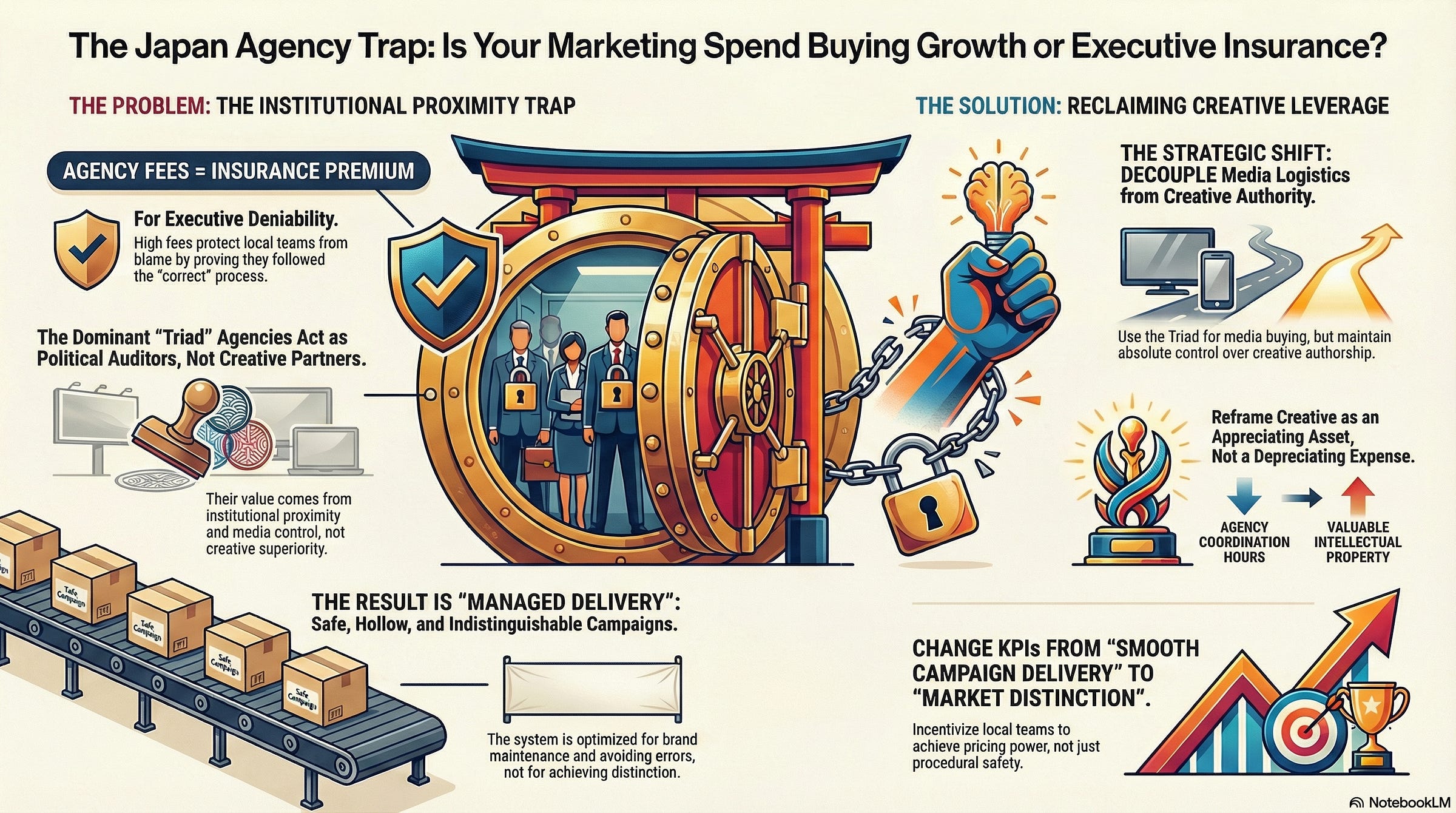 The CMO is witnessing a “Managed Delivery.” The agency has not been hired to create a competitive advantage; they have been hired to provide Institutional Cover. If the campaign fails to move the needle, the local team can point to the agency’s pedigree and the “proven” media model as proof that they followed the “correct” process. In the Japanese corporate system, following the correct process is often more important than achieving the correct result. The brand is not paying for creativity; it is paying for a shield.