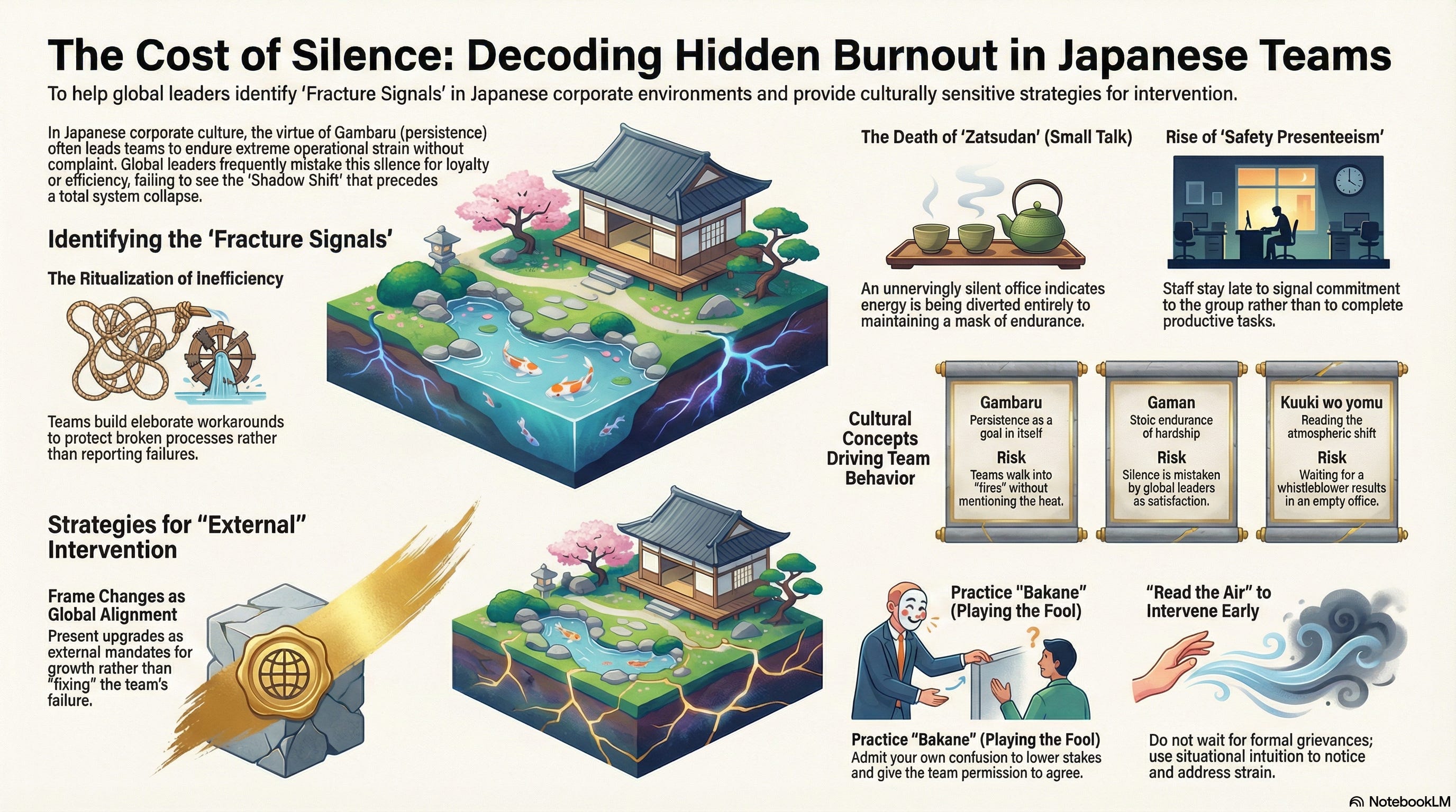 This creates a “Spiral of Silence.” Because Japanese communication is high-context meaning the most important information is often unsaid, the lack of complaints is frequently misread by global leaders as an endorsement of the status quo. In reality, the team may be trapped in a cycle of Gaman (stoic endurance), waiting for a leader with enough “situational intuition” (kuuki wo yomu) to notice the strain and intervene without being asked.